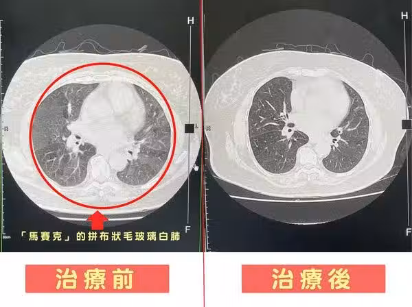 幸好婦人揪出病因後對症下藥,經過3個月的療程後,那些像馬賽克的「拼布壯毛玻璃白肺」幾乎消失了,再也不會出現喘不過氣的情形!