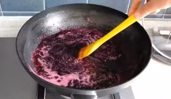 3、繼續用小火煮,不停地用勺子攪拌,防止粘鍋,當鍋里的葡萄汁變得很濃稠,像果醬後就關火,檸檬擠出一些檸檬汁倒入鍋中,用鏟子攪拌均勻。