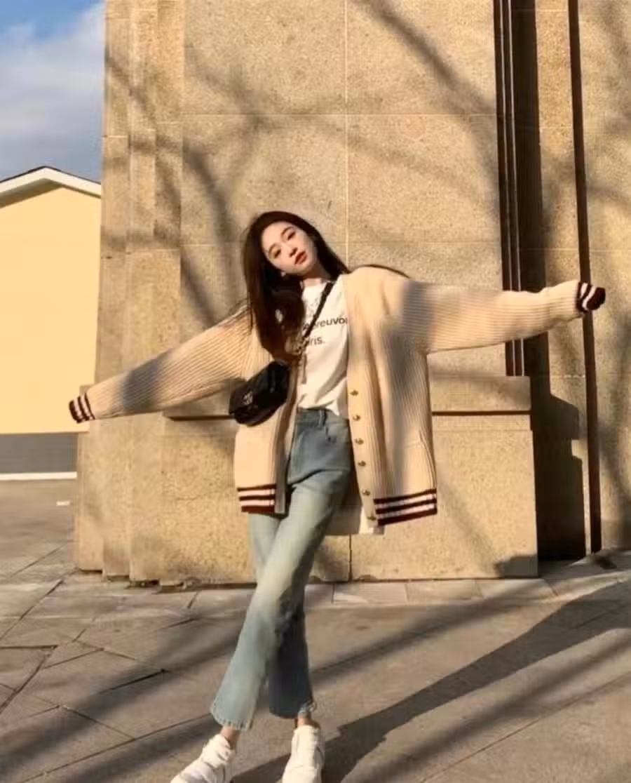 搭配出來溫柔知性的氣質襯托感,所搭配的直筒褲要優先於選擇重垂感、且設計版型屬於基礎款,且略微寬松一些的款型遮肉更舒適,上衣搭配材質搭配軟質化的單品感。提襯溫柔簡約