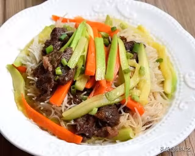 廣東排米粉150克、牛肉150克、西葫蘆1根、胡蘿蔔1根、姜10克、蒜2瓣、鹽2克、生抽20ML、料酒10ML、玉米澱粉5克、蔥適量。