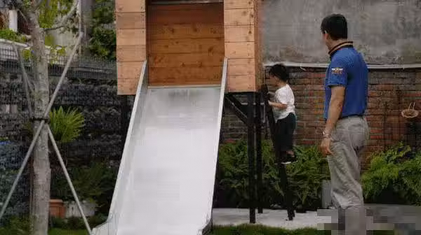 我兒子很好動,我爸爸就在院子旁幫他做一個溜滑梯,祖孫兩個很常在一起玩。