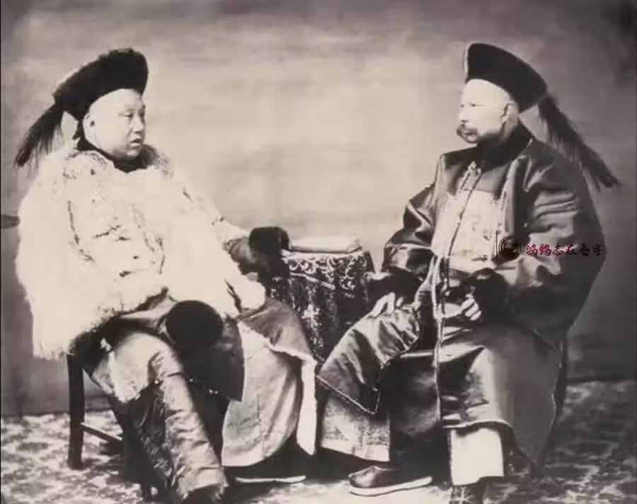 兩位大清的官員,面肥耳大,身材臃腫。左邊的身著貂皮大衣,右邊這位身穿朝服,都位高權重。二人並沒有電視劇中那樣英俊威武,卻也官威十足。清末朝廷已落頹勢,八股選士弊端日甚,到處可見「捐官」者。上任後也是「三年清知府,十萬雪花銀」。