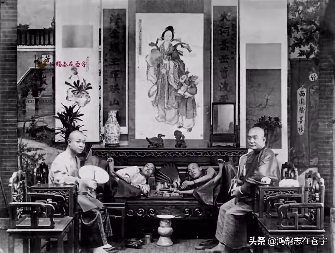 四位公子哥在雅舍抽大煙,功名已是身後事,「去到考場放個屁,也替祖宗爭口氣」成了當時流行的諺語。清末,大清王朝已經讓鴉片搞得烏煙瘴氣,大菸癮風靡全國,再殷實的家也會被傾家蕩產。