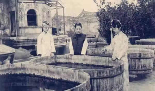 圖為端康太妃——即瑾妃(中)和溥傑原配唐石霞(右)等在延禧宮觀賞金魚。問:瑾妃與溥傑的生母有什麼恩怨?