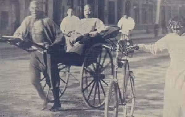 圖4:清末的人力車和腳踏車在清末都屬於新事物,前者自日本傳來,後者自歐洲傳來,但後者在當時更昂貴、更難得一見。同治年間,腳踏車已經出現在上海,後來逐步擴散到其他大城市。