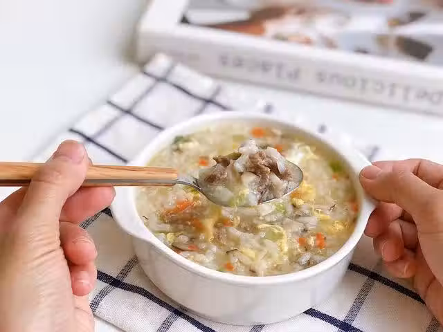 4、最後把所有食材倒入電飯煲中,加入適量的水,熬煮30分鐘左右即可。出鍋前加點蔥花增色增香,讓整道粥看起來更加有食慾,喜歡的話還可以加點胡椒粉,增香開胃。