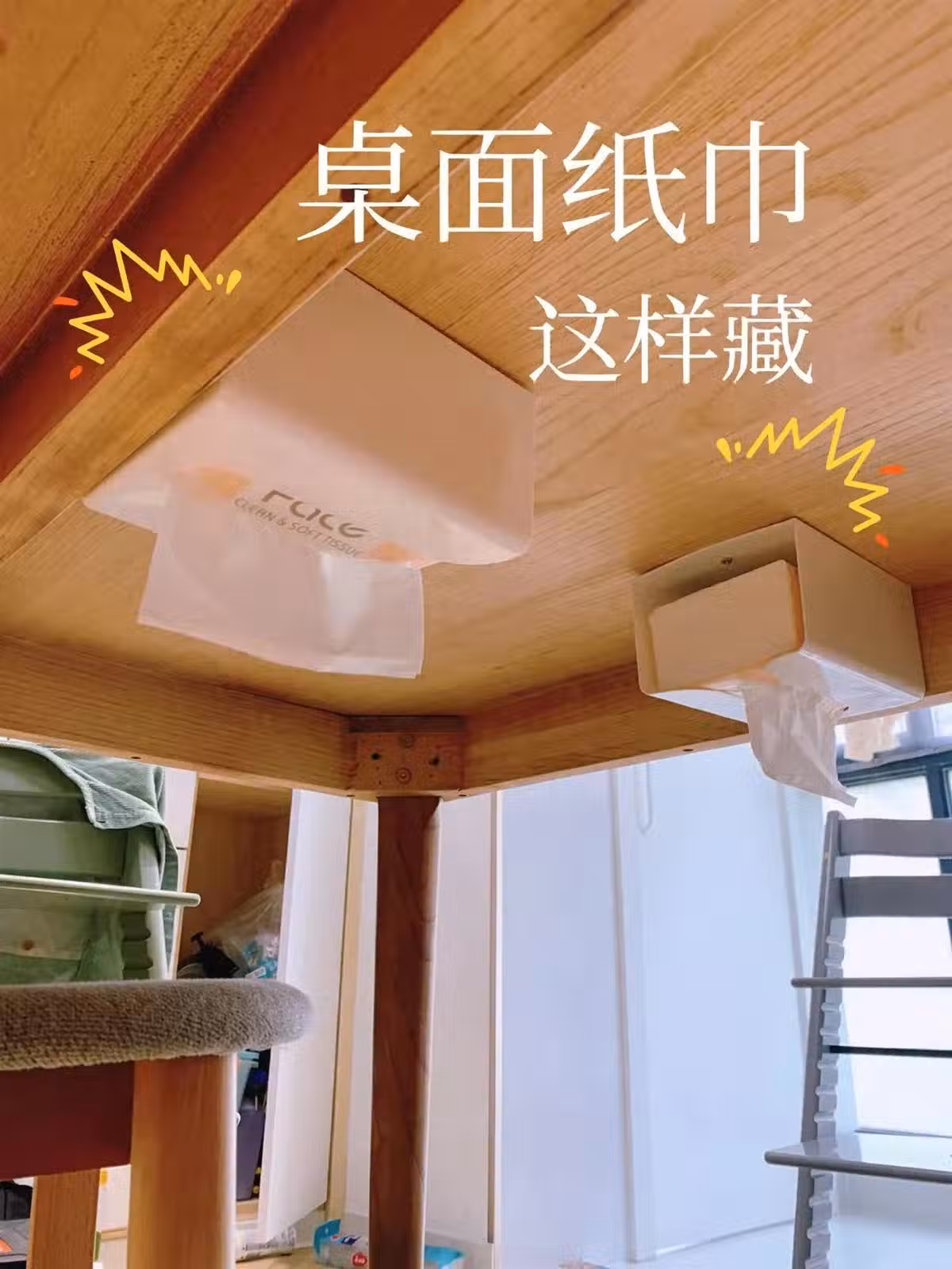 比如餐廳,可以用掛袋式紙巾收納,占據桌面位置,用的時候也不會被飯菜搞臟。也可以在餐桌下面掛紙巾,隨用隨抽,用起來也很方便。