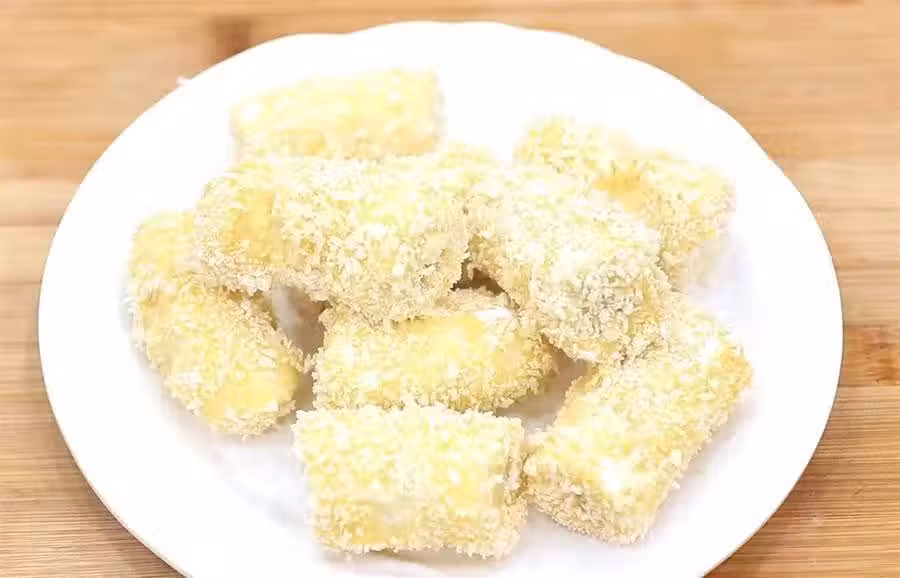 鍋內燒油,油溫五成熱時轉為小火,把香蕉放入鍋中慢慢炸,香蕉炸酥、炸成金黃色就可以了,一道香甜可口的黃金香蕉就做好了。