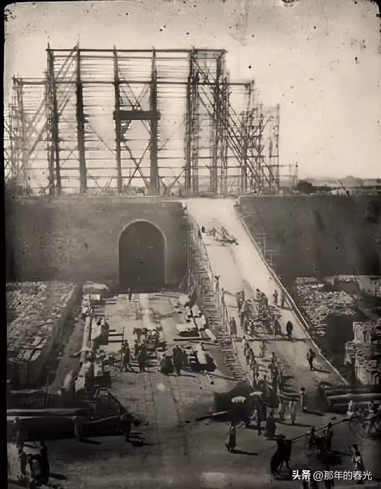 這是一張拍攝於1903年的照片,當時的工匠們正在修建城門和箭樓,在城牆下設有專門運送材料的坡道,上面已經使用衫篙搭投好了支架。