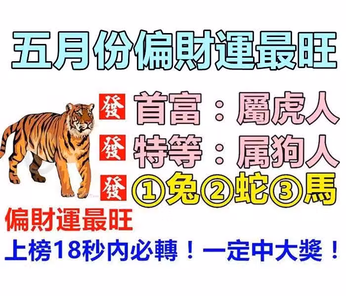 進入五月份屬虎的人的身上總是會被好運所圍繞,同時屬虎的人總是會給人帶來正能量,他們總是積極向上,充滿自信,這樣的他們總是會帶動周邊的朋友,讓他們也是充滿活力的。 好運總是會眷顧不斷努力的人,所以在五月份好運會不斷的靠近在屬虎的人的身上。