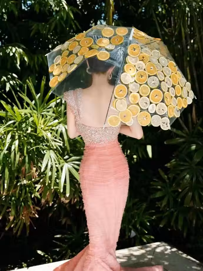 工作室還曬出了一張大冪冪撐著水果傘背影出鏡的美照。