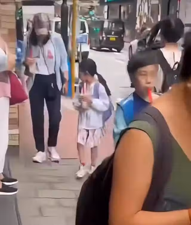 該博主附文:「在香港街頭偶遇郭晶晶穿著低調接地氣,出行也沒配司機周末帶著女兒上興趣班,沒有上去打擾兩母女。」視頻中可以看到,郭晶晶以一身簡單樸素的打扮現身,更戴上cap帽,十分低調,與女兒並肩而行聊天,三母子手上都拿著一杯珍珠奶茶,兒子則在前面先行一步,大口喝著奶茶,全程都未有見到有保鏢或者司機在側。