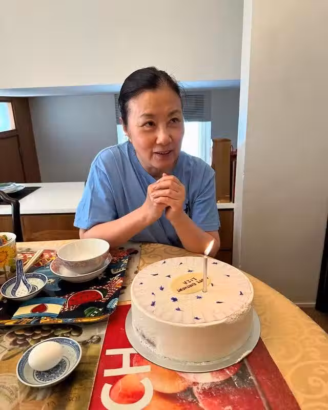 照片中可見,壽星的汪明荃沒有特別化妝穿得靚靚,她只簡單束起馬尾,穿著粉藍色的家居服,她與兩名外傭姐姐和兩頭愛犬在家中慶祝,汪明荃心情大靚,許願和吃蛋糕時,臉上流露著幸福的笑容。