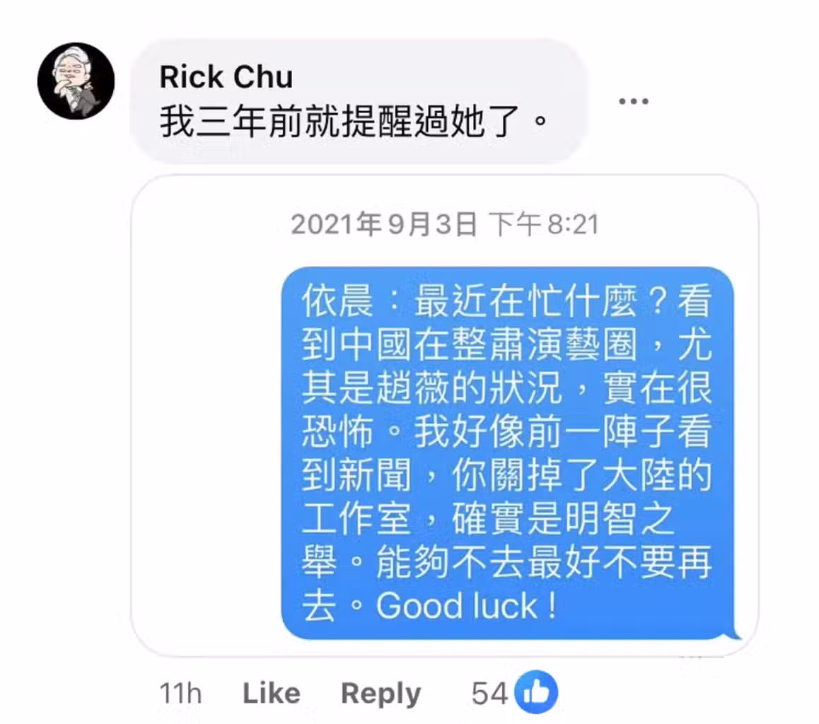朱立熙事後更在留言區公開一則私訊,表明在2021年9月3日時,因為女星趙薇遭大陸封殺,林依晨當時也關閉大陸工作室,因此發訊關心,並建議她對岸可以不去就不去,但如今卻仍一意孤行,讓他感嘆,「我三年前就提醒過她了」。今日他更語重心長地寫下,「已不再是18歲剛出道的小女生,還可以『裝可愛』,她已經是42歲的媽媽了,對於世事的大是大非,應有基本的判斷能力」,直言林依晨此次的行為簡直「不可原諒」。