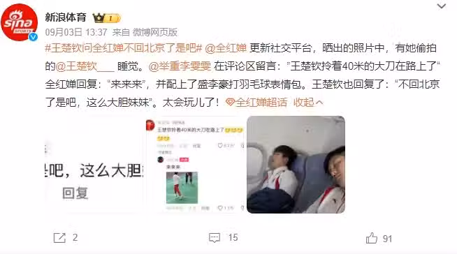 相信大家都知道王楚欽與全紅嬋的那個熱搜,全紅嬋在個人社媒發王楚欽張嘴睡覺的丑照,王楚欽評論:不回北京了是十八、這麼大膽妹妹。這時候兩人實際上都在北京。