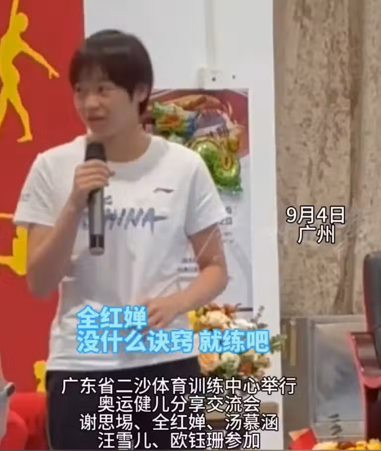 在分享會現場,主持人再度提到全紅嬋如何克服207C軟肋,全紅嬋已經不止一次在公開場合談這個話題,她的表情有些尷尬,隨後說道:「我覺得沒什麼訣竅吧,就練吧,克服緊張的辦法就是要相信自己,展現訓練的成果。」