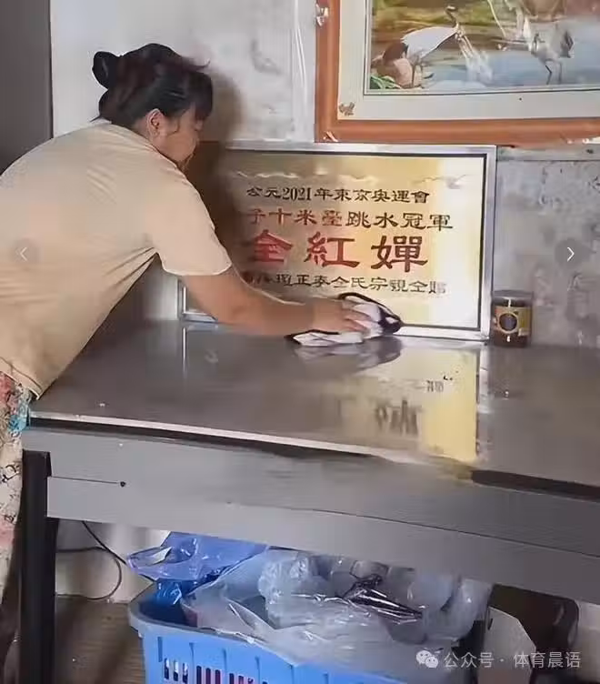 這邊全紅嬋在廣州為父母購買禮物被網友們拍到,而在全紅嬋老家,有消息稱全紅嬋的媽媽正和家人們一起,在家搞大掃除,在做好全紅嬋回家的準備工作。從流傳出來的圖片中可以看到,全紅嬋的媽媽正在家裡進行清掃,將獎牌和桌子都擦得乾乾淨淨。看得出來,媽媽的心情非常好,畢竟寶貝女兒要回老家了,想想都開心。