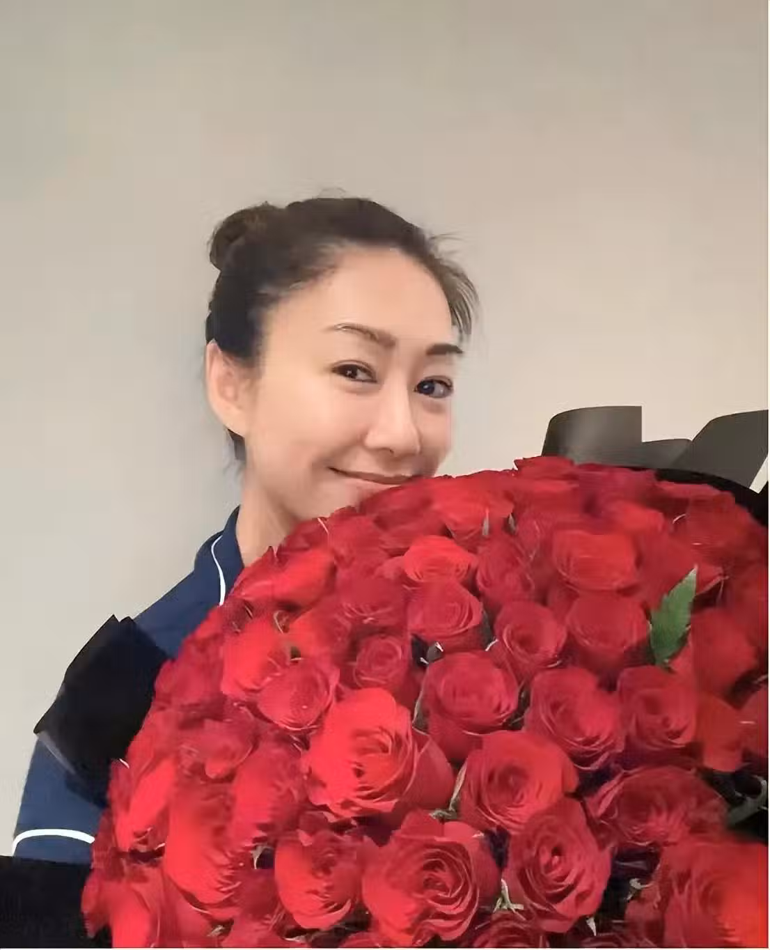 從胡定欣上傳的照片中可見,她身穿寶藍色睡衣素顏上陣,臉色皮膚白皙,狀態很是不錯,懷中抱著差不多有100朵紅玫瑰,很是開心。