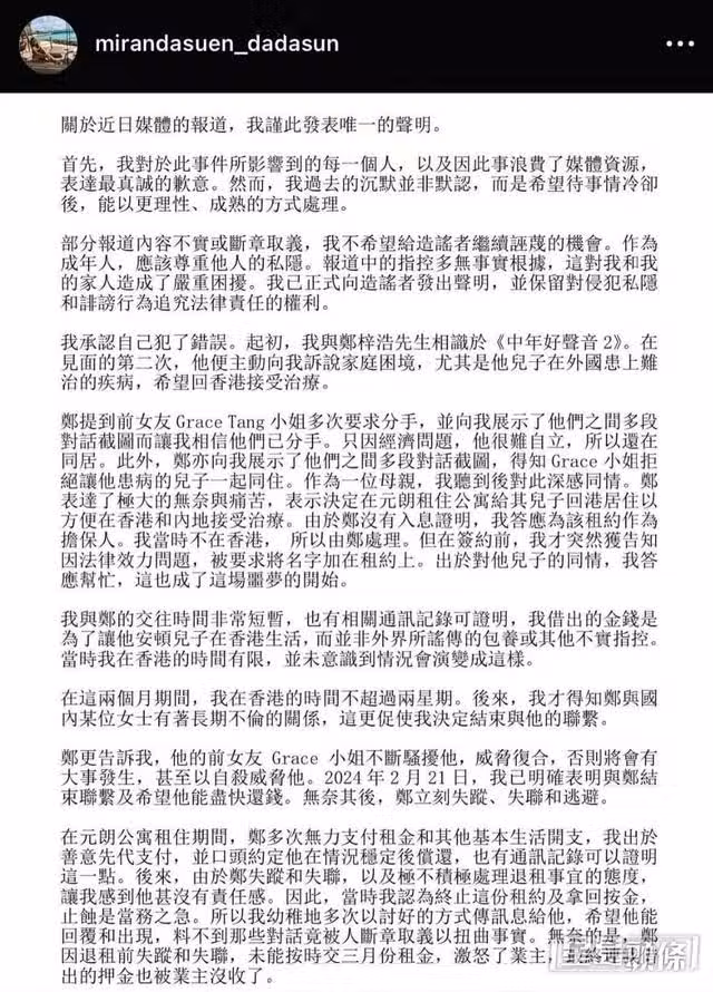 醜聞曝光5日,孫美賢重開社交帳號出聲明承認和鄭梓浩曾有短暫交往,但非包養關係,又反指Grace不斷騷擾鄭梓浩,甚至以自殺威脅他。而變過街老鼠的鄭梓浩為補救,在粉絲群駁斥所有指控,否認出軌,甚至稱沒有收過Grace的幾百萬。