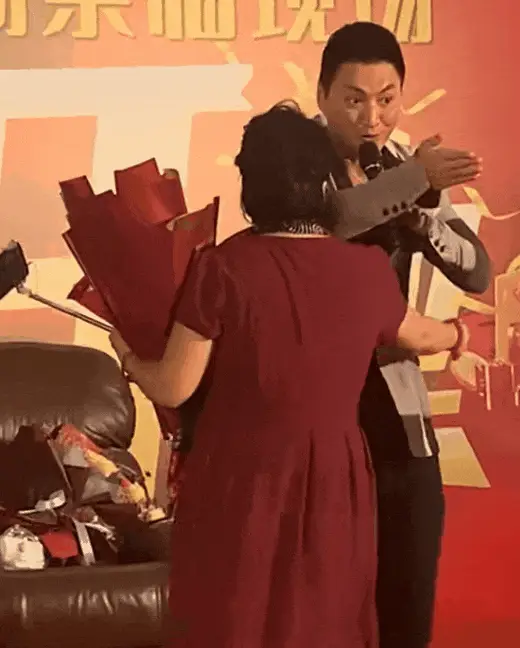 何家勁可能覺得配合抱一抱就可以了,沒想到這才只是開始。大媽遲遲不肯鬆開擁抱,還貼著他的脖子說了些什麼話,何家勁開始變得不知所措,表情慌亂,又不好發作,就加快了拍肩膀的頻率,還大喊了一聲「OK」。內心獨白肯定是「可以了吧,可以了吧」。