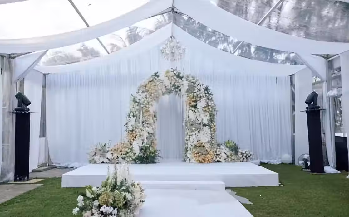 在主迎賓位上面,擺著很多小巧思的浪漫。桌上擺著的鮮花,還有整個婚禮現場的鮮花,相互交印在一起,溫馨雅致,很有氛圍感。