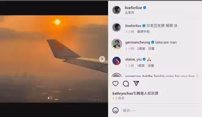 他同時也在社群貼文,照片是飛機的機翼,一旁還有微弱的陽光,他配文寫下:「你老豆姓啊啊啊徐。(你爸爸姓什麼,姓徐)」好友們紛紛留言安慰:「take care,man」、「Take good care」、「節哀」等等,以及雙手合掌的圖示以表慰問之意。