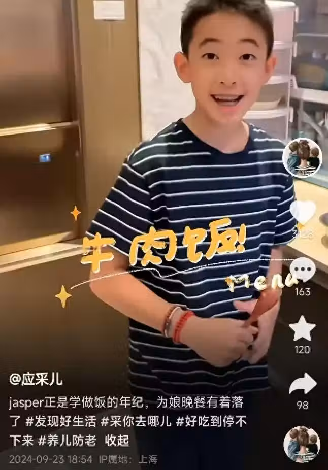 9月23日,應采兒在個人社交平台分享了一段大兒子Jasper下廚做飯的vlog,這是Jasper第一次下廚,所以應采兒也是全程激動記錄。老母親還發文寫道:「Jasper正是學做飯的年紀,為娘晚餐有著落了」,看得出來,對於兒子的長大懂事,應采兒真的是滿滿自豪和驕傲。