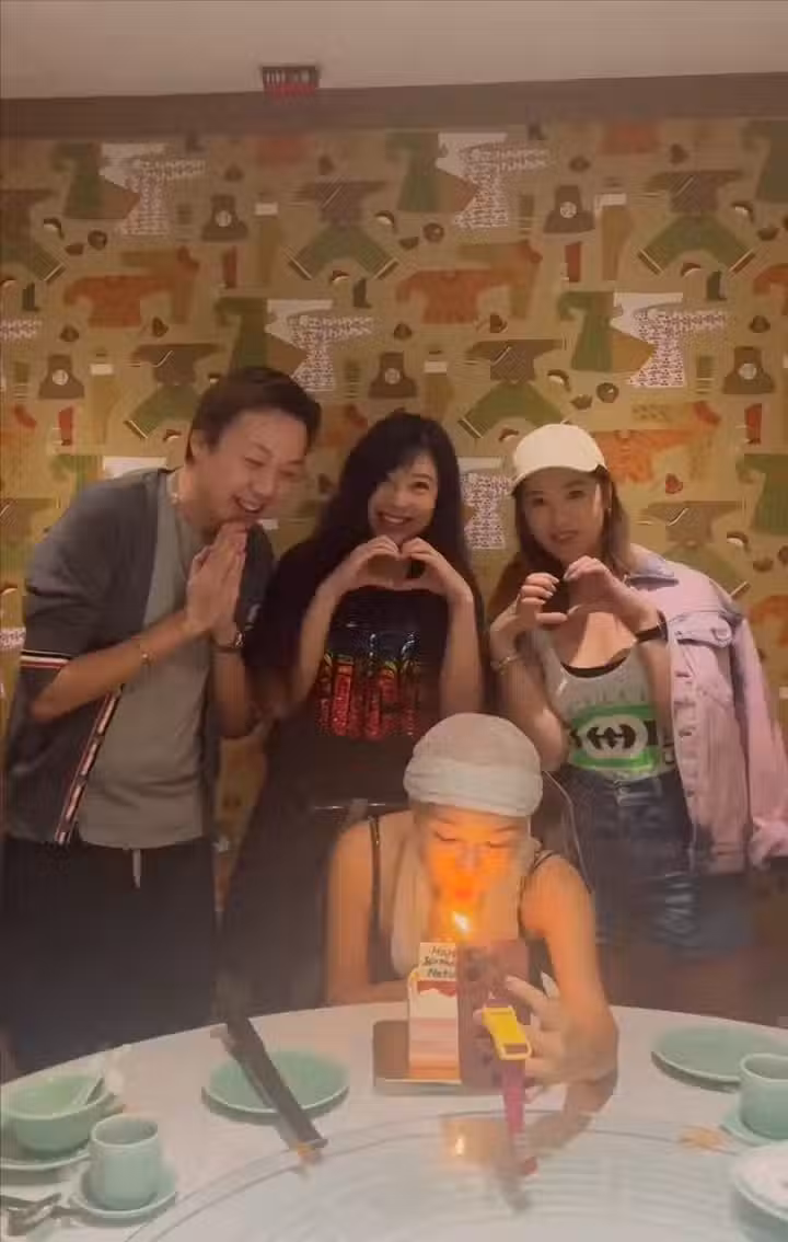 吳文忻昨日(25日)亦在IG貼出生日視頻,並答謝鄭紹康、前港姐傅明憲和翁嘉穗為她慶生,吳文忻當晚更轉換兩個造型,她戴上假髮及cap帽,一臉精神奕奕與翁嘉穗合照,她與傅明憲合照時,對方更鬼馬伸舌頭。