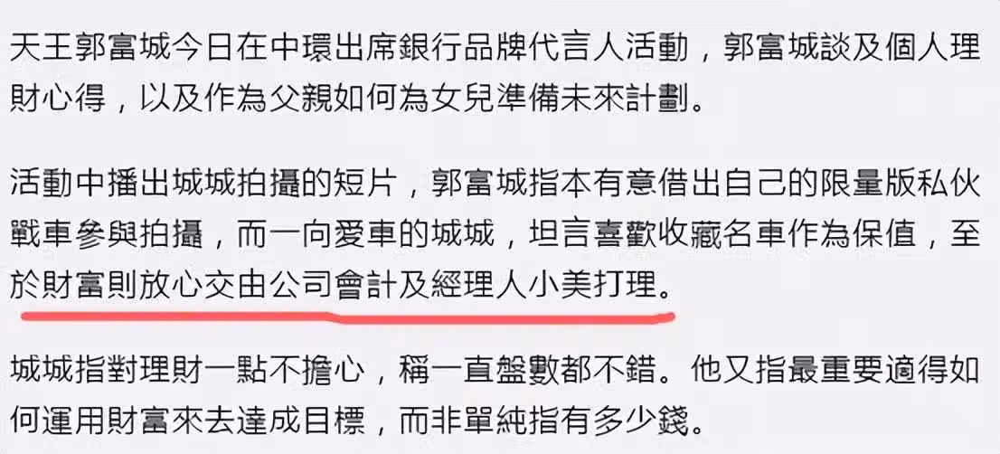眾所皆知,小美是郭富城的「管家」,郭富城曾在活動中承認,他結婚後過億財務仍交給小美打理。