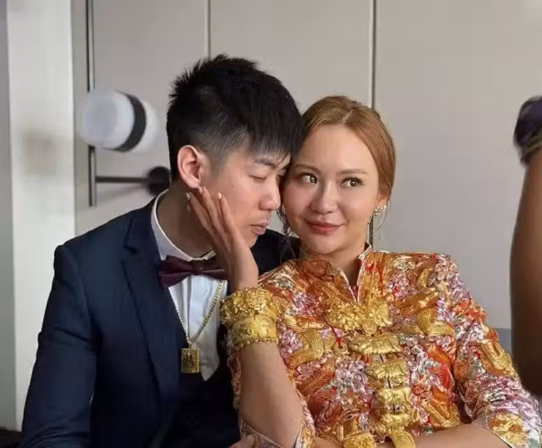 從港媒曝光的圖片可以看到,麥詩敏化著精緻的妝容,穿著定製的鳳袍,整個人顯得雍容華貴。