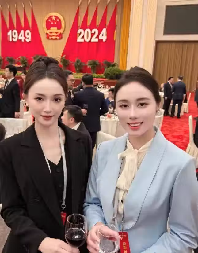 何超欣與現場的姐妹合影,兩位美女端著酒杯相慶,共同為商會貢獻自己的力量。