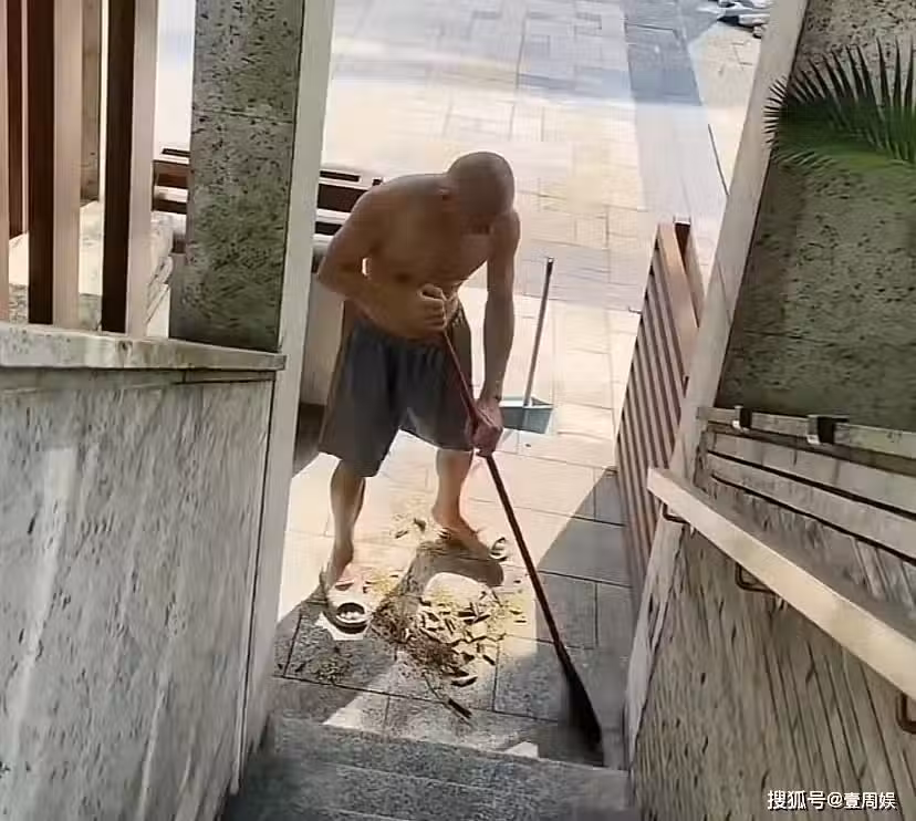 61歲江華穿拖鞋赤身掃地,身材健碩勝過同齡人,網友:挺像寺廟的住持