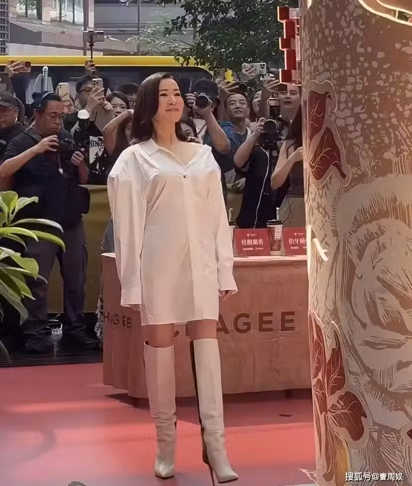 當天的阿佘心情看起來很是不錯,一頭招牌的短髮亮相現場,她身著白色的露肩連體裙,搭配著細根長靴,很有少女的氣息,雖然不至於十八歲,但完全看不出快滿50歲了,狀態相當的好。