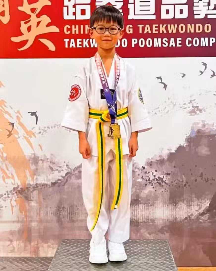 照片中,奕霆身穿白色跆拳道服,脖子上掛著金牌站在領獎台上,面帶微笑,看起來十分乖巧可愛。今年6歲的他長高不少,完美繼承了爸爸媽媽的優越身高,而且模樣也是十分帥氣。
