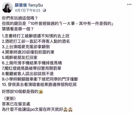 蘇慧倫洋洋洒洒寫下「1.念書時打工被辭退還不知情的去上班」、「2.酒吧打工卻一直記不得客人點的酒名」、「3.上台演唱麥克風卻拿顛倒」、「4.開車時速20卻撞到前面的車」、「5.喝醉被朋友扛回家」、「6.上廁所滑手機結果手機掉進馬桶」、「7.闖紅燈過馬路被帶回警局開罰單」、「8.餐廳被客人認出卻說我不是」、「9.小學時騎腳踏車衝下坡把同學的門牙撞斷」、「10.穿很美去看演唱會結果路邊摔個狗吃屎」,接著她要網友留言寫下答案,看看會不會有人猜對。