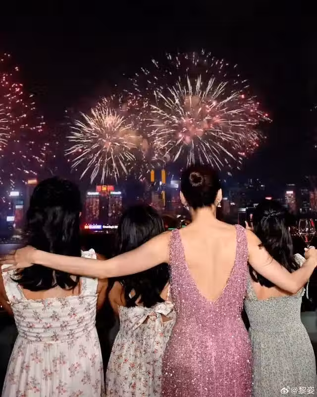 看煙花的時候,黎姿摟著三個女兒,母女四人的背影看起來很有愛。而黎姿的父母身體還是非常不錯的,他們拍照時精神奕奕,尤其是黎姿的母親,笑的非常開心。
