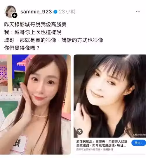 ▲曾國城不只一次向短今說過她長的像高勝美,還夸對方連講話方式也很像,讓好奇的短今忍不住發文。(圖/sammie_923 Threads)