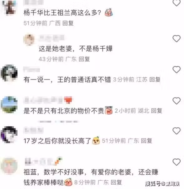 網友評論:「祖藍,數學不好沒事,有愛你的老婆,還會賺錢養家棒棒噠。17歲之後你就沒長高了。是不是只有北京的物價不貴?有一說一,王祖藍的普通話真不錯。楊千嬅比王祖藍高這麼多?這是他老婆,不是楊千嬅」