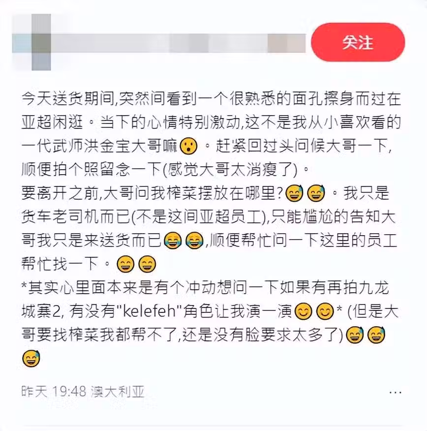 有網民日前於社交平台上發帖,分享在澳洲墨爾本的一間當地超市送貨期間,巧遇「大哥大」洪金寶,樓主寫道:「今天送貨期間,突然間看到一個很熟悉的面孔擦身而過,在亞超閒逛。當下的心情特別激動,這不是我從小喜歡看的一代武師洪金寶大哥(大)嘛? 趕緊回過頭問候大哥(大)一下,順便拍個照留念一下,感覺大哥(大)太消瘦了。」