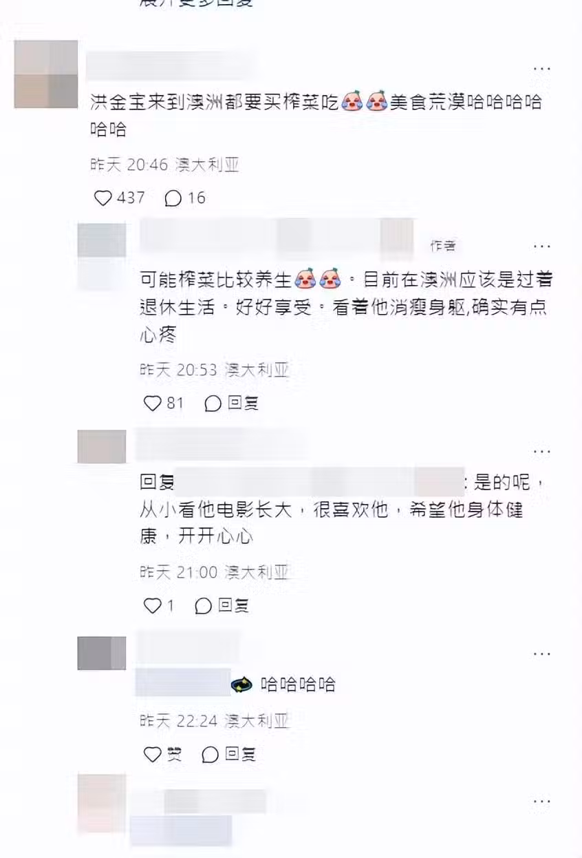 然而,「洪金寶尋找榨菜」這個話題隨即引起網民們熱烈討論,不少人都表示,會否是因澳洲是個美食沙漠,逼得洪金寶來到澳洲都要吃榨菜開開胃。有網民則開玩笑說,可能榨菜比較養生,引起了有人提出疑問:「榨菜真的養生嗎?」