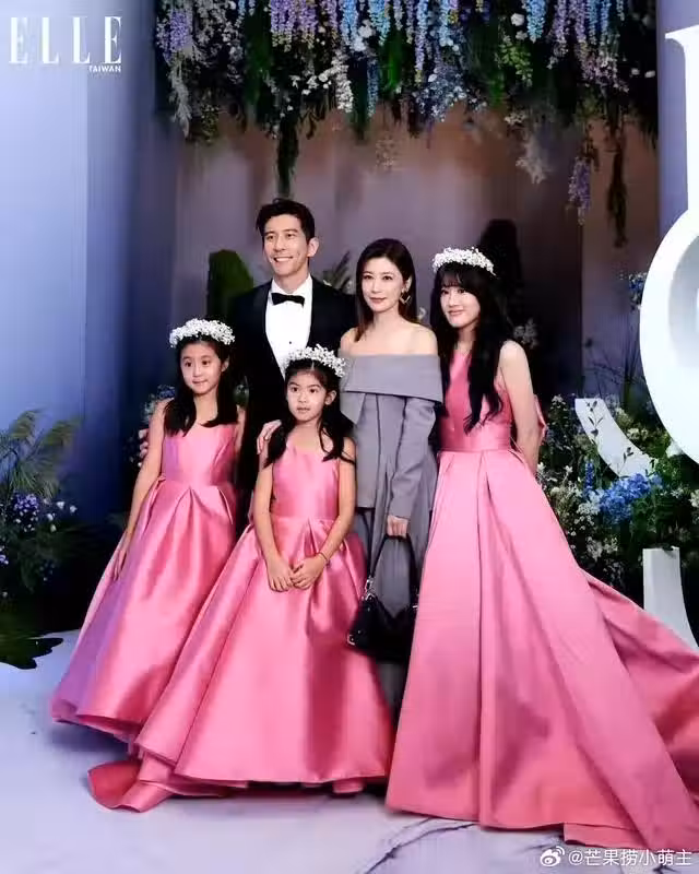 賈靜雯一家參加蕭敬騰婚禮,三朵金花都好美,二女兒咘咘最像媽媽