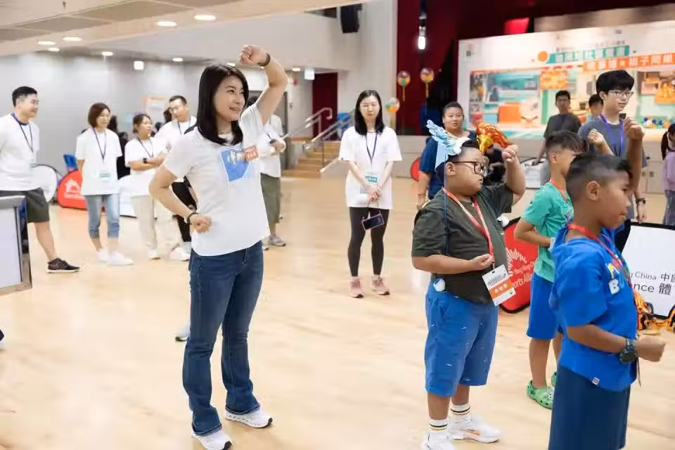期間郭晶晶還和小朋友一起打拳,一起玩空手道。