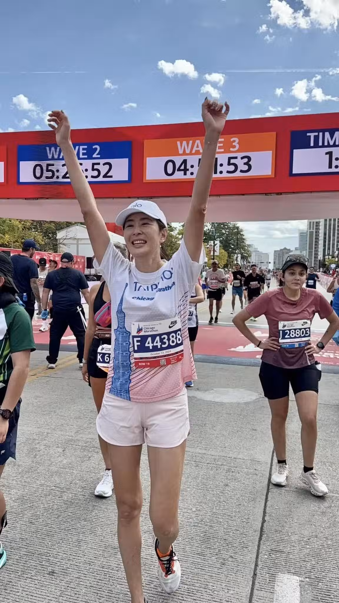 她一路堅持跑到終點,最後忍不住抱著女兒哭了,除了感謝幫她製作T恤的廠商,還有女兒特別從LA到芝加哥替她加油,完賽後她宣布封腿,再也不參加比賽了,「然後我再也不要跑了認真」。