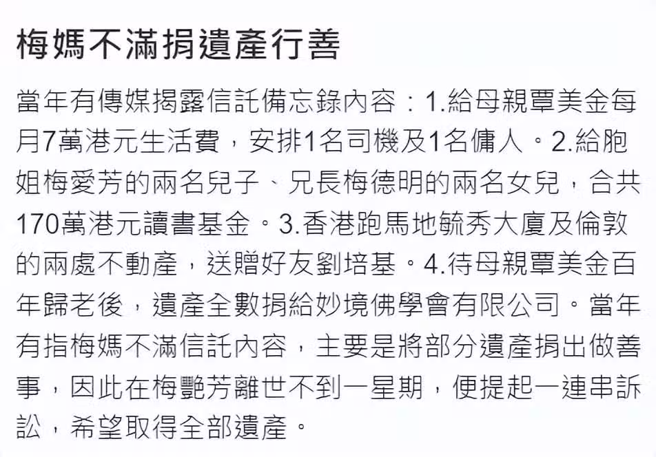 法院考慮到通貨膨脹決定逐漸增加梅媽的生活費,從最初的7萬漲到現在每個月25萬港幣,一年合計300萬的生活費,摺合人民幣275萬。