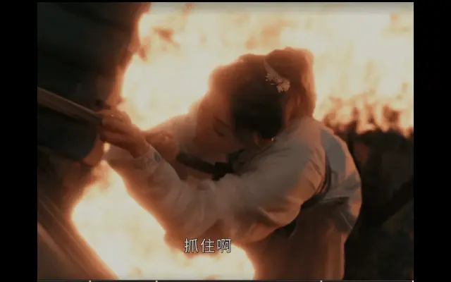 女孩穿著裡衣,被父親拉到木質結構的樓邊,樓很高,到處都是火,樓的半邊也都已著了火。