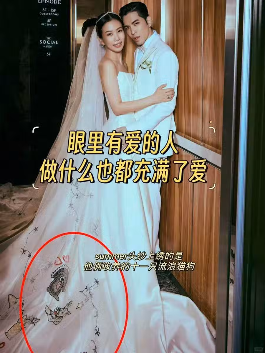 蕭敬騰與林有慧(Summer)這對情侶終於步入婚姻殿堂,他們的婚禮不僅甜蜜浪漫,還透露出獨特的愛意符號。新娘林有慧的頭紗上,竟然繡滿了11隻貓貓狗狗的圖案——這可不是隨便的設計,而是他們共同收養的寵物們。頭紗上的這些小毛孩圖案,象徵著他們在16年愛情長跑中的默契與共同生活中的點滴。