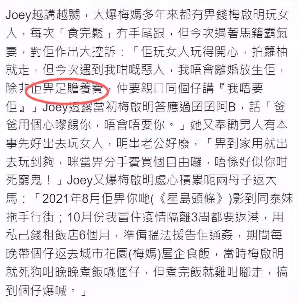 Joey透露梅啟明在2022年被曝出軌後,一度寫下悔過書求原諒,當時梅媽不想和兒子一起生活,給了20萬讓他們一家三口搬走,結果梅啟明騙太太回馬來西亞,拿著錢轉身就去找情人。