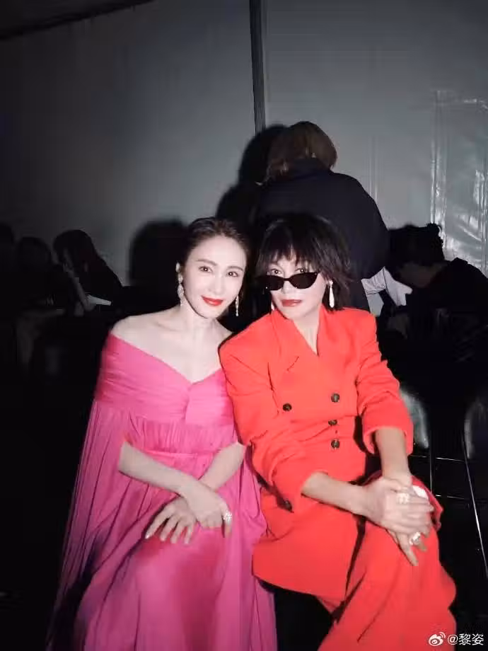 相中,身穿一襲粉色抹胸綢緞晚禮裙的黎姿,與一身大紅幹練西裝穿搭的惠英紅並肩而坐,二人緊挨著坐在台下齊齊對鏡淺笑,雖說平日裡私下見面次數並不多,但聚首時仍有說不完的話題。
