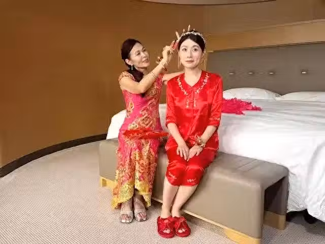 從流出照片可以,新娘龔敏晴身穿傳統紅色秀禾服出嫁,妝容精緻,笑容甜美,最引人矚目的是陪嫁首飾眾多,其中幾對巨型龍鳳鐲一看就知道重量不輕,價值不菲。可見男女雙方父母都非常捨得,用心又用金去祝福這對新人。