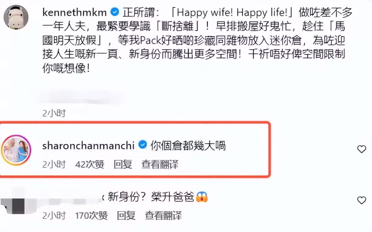 網民都猜測馬國明是在官宣當爸爸,並紛紛留言送上祝福:「新身份?榮升爸爸」、「官宣當爸爸了?」、「做爸爸」。更有很多人留意到他的珍藏:「我見到松隆子、酒井法子和廣末涼子」、「獨角獸就留在家,迷你倉就放唐老鴨,松隆子,酒井法子,廣末涼子。」